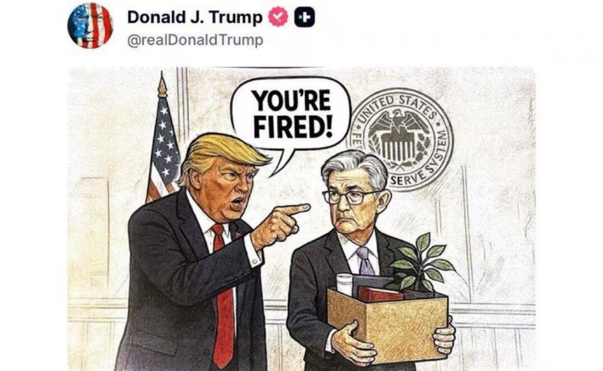 当地时间 9月27日(周六),美国总统特朗普在其社交平台 Truth Social 上发布了一张卡通图片,画面显示其对美联储主席鲍威尔喊话"你被解雇了!(You're fired)"。